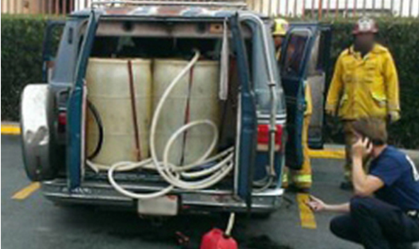 Some recognition clues for a fuel theft vehicle may be similar to an vehicle borne improvised explosive device (VBIED) or vehicle used to employ a Fire-as-a-Weapon (FaaW) attack. Based on the totality of the circumstances, consider the need for support from a bomb squad.